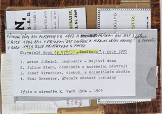 Fotokoláž, 11 x 16 cm, dům Kaulbach na dnešní tř.TGM v Karlových Varech, sklo, rám.