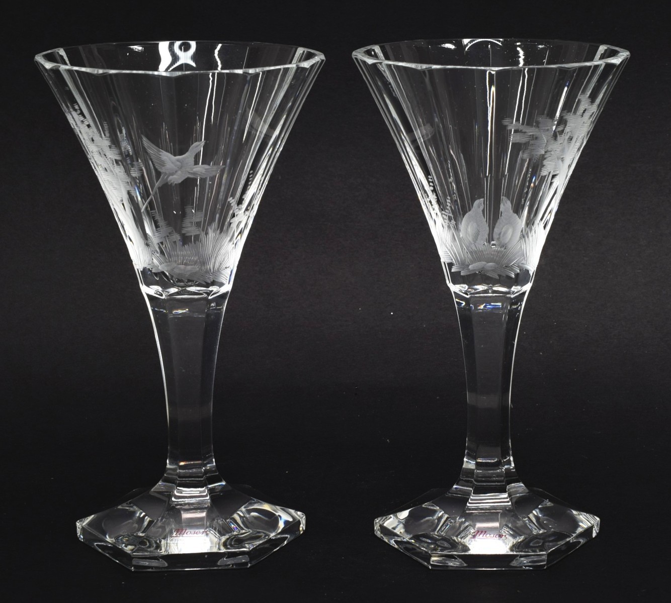 Dva poháry, bezbarvé sklo, výška 13,5 cm, broušené, řezaný motiv ptáka v krajině, značeno fóliovými nálepkami Moser Czech Republik, originální firemní etue, na horním okraji