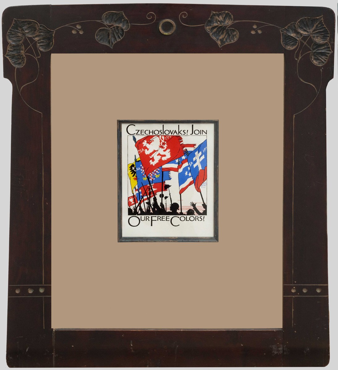 Propagační plakát "Czechoslovaks! Join Our Free Colors!" barevný tisk, reprint původní práce VOJTĚCHA PREISSIGA z roku 1938. Rámováno v krásném secesním rámu zdobeném národním symbolem -listy lípy, paspartováno. ___Výřez 20 x 15 (63,5 x 53) cm ___O AUTOROVI: Preissig Vojtěch (1873-1944) Malíř, publicista, grafik, ilustrátor, odbojář. Studoval na Uměleckoprůmyslové škole v Praze u Friedricha Ohmanna, grafiku studoval soukromě v Paříži v ateliérech Emila Delauna a Augusta Schmida. Vynikající český malíř a grafik světového jména, pracoval v Paříži pro Alfonse Muchu. Velké zásluhy má na grafickém umění v USA, kde dlouho působil, řídil grafické oddělení na Wentworth Institute v Bostonu. V řezbě do linolea byl považován v USA za zakladatele. Vystavoval v Mánesu, má široké zastoupení v Národní galerii Praha, ve Waldesově galerii, v galerii v New Yorku a dalších světových galeriích. Během druhé světové války byl členem ilegální skupiny, vydával ilegální časopis V boj. Jeho dcera Irena, která mu pomáhala, byla popravena. Zemřel v koncentračním táboře Dachau.