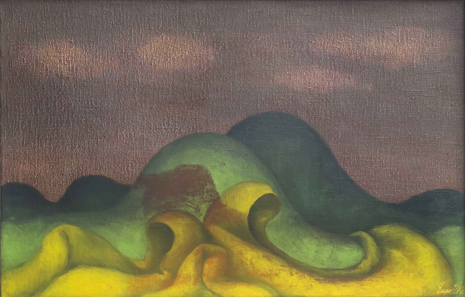 "Beskydská krajina" olej na plátně, signováno vpravo dole LEPÍK K, kolem roku 1970, vzadu štítky s informacemi o obraze s původní cenou 11 500 Kčs, což odpovídá dnešním cca 100 000 Kč, kvalitní rám z masivu. Sbírkový kus ovlivněný moderními směry šedesátých let. Velký reprezentativní obraz. ___66 x 101 (80,5 x 115) cm ___O AUTOROVI: Lepík Karel (1940-) Malíř, grafik, studoval na Akademii v Praze u profesora K. Součka, jeden rok studijně pobýval na Academia Belle arti Pietro Vanucci v Perugii, docent katedry výtvarného umění Pedagogické fakulty Ostravské univerzity, citace ze Slovníku Chagall: "V jeho díle se objevují filozofující náměty v nichž vědomě navazuje na imaginaci surrealistického a symbolistního pojetí světa", dále je ve Slovníku výčet desítek výstav a literatury o tomto významném malíři.