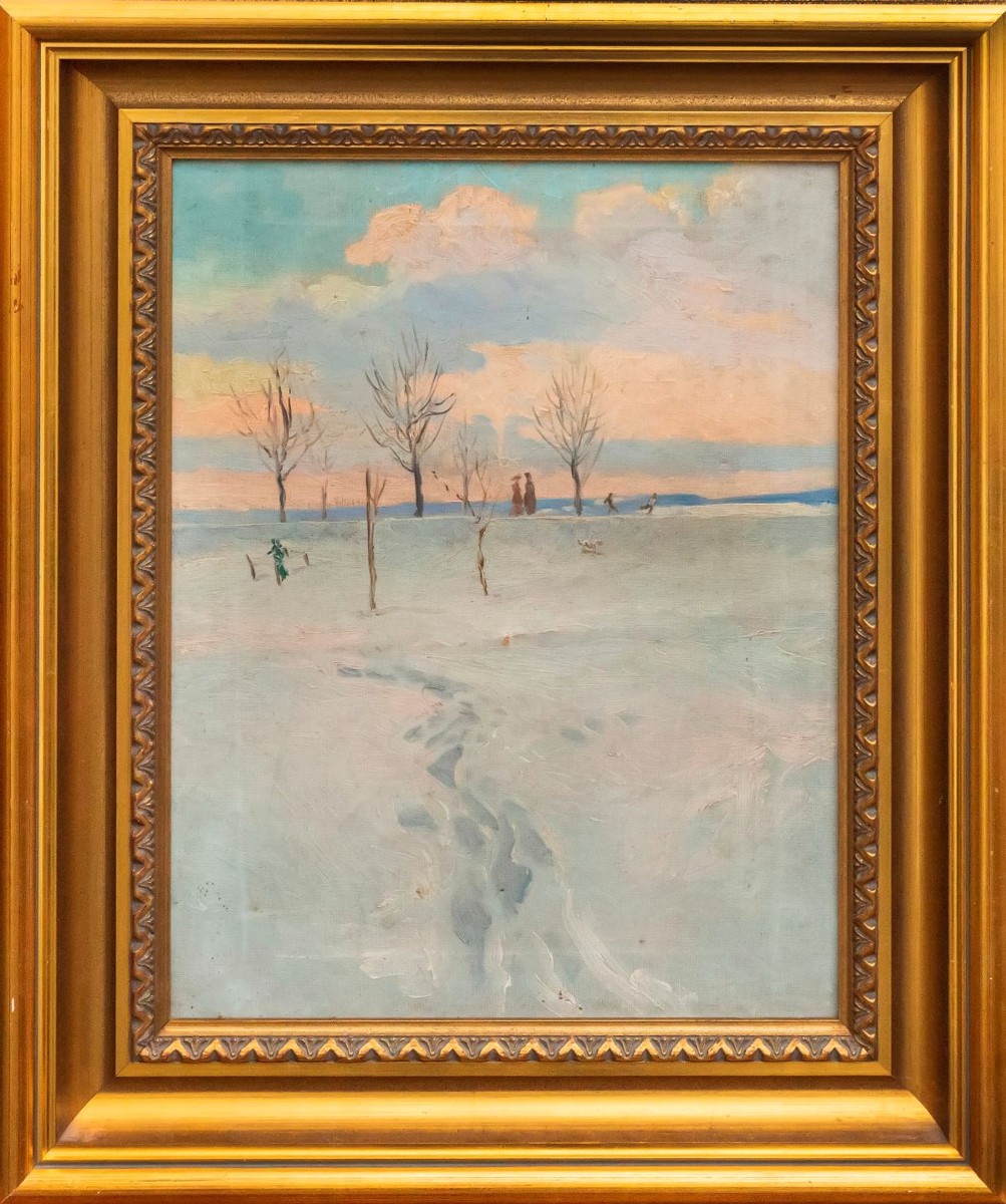 "Zimní krajina s figurální stafáží" olej na plátně, nesignováno, vzadu na blind rámu pozůstalostní razítko s datem 26.8.1942 a s podpisem Anny Tůmové. Uvedeno také, že obraz byl vystaven pod číslem 40 na posmrtné výstavě Karla Tůmy říjen-listopad 1942. Plátno uprostřed drobně perforováno. ___50 x 39 (69,5 x 57,5) cm ___O AUTOROVI: Tůma Karel (1859-1936) Malíř podobizen, krajin a válečných výjevů, studoval na akademii v Praze 1874-1879, dále na akademii ve Vídni, působil jako učitel kreslení ve Vídni. Již jeho první výstavu komentoval Jan Neruda slovy: "Mladý malíř jeví zdravý smysl pro genre". V roce 1938 byl zasoupen na výstavě "Náš voják ve výtvarném umění XIX. a XX. století" konané v Obecním domě v Praze.