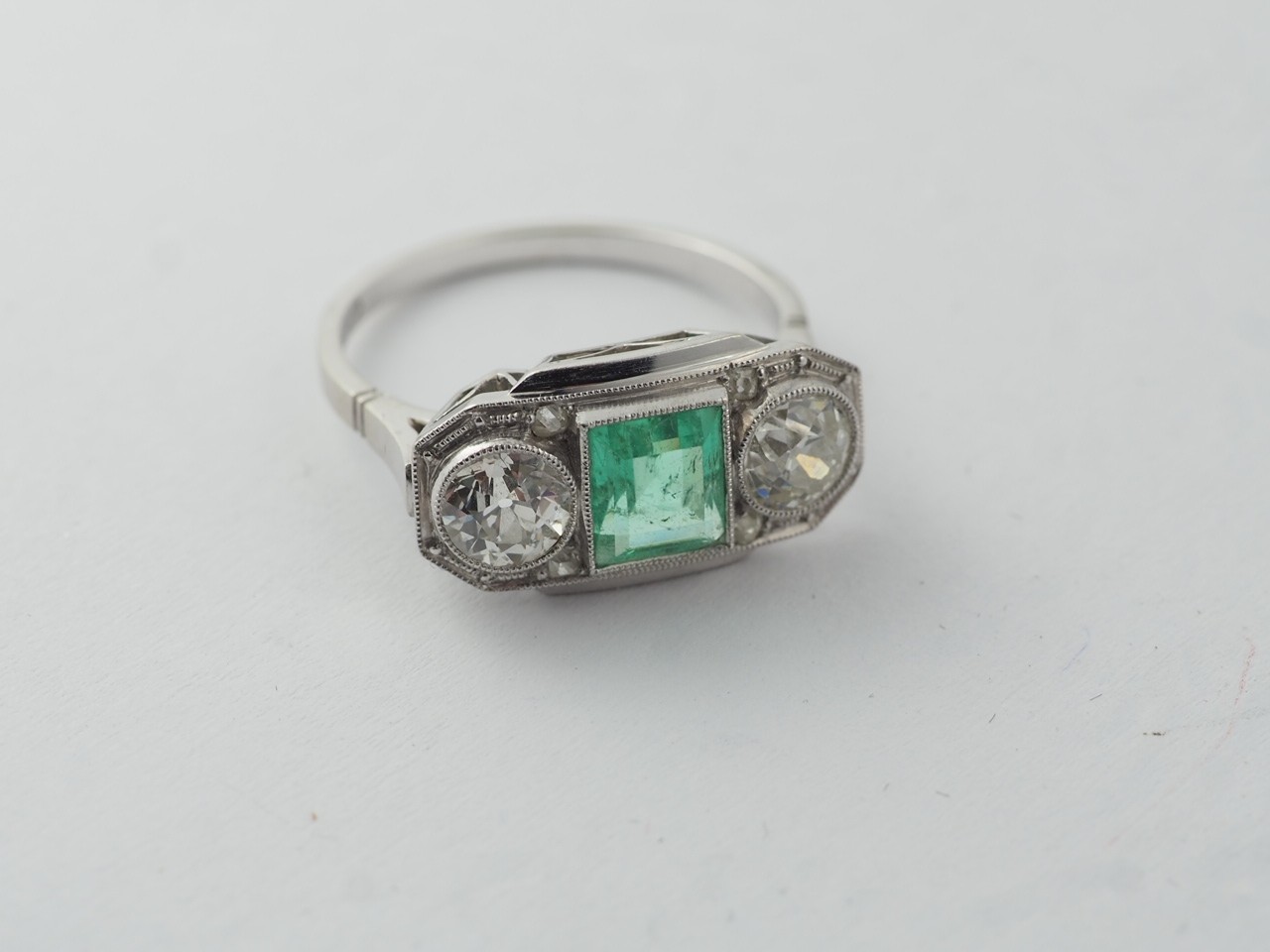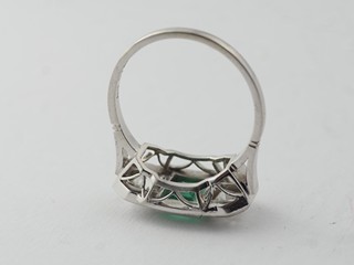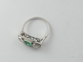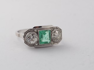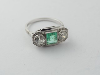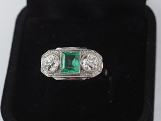 Prsten s brilianty a přírodním smaragdem, Au 585/1000, punc: lev se 4, váha 4,32 g btto, 2 x 0,5 ct briliantů, 1. republika