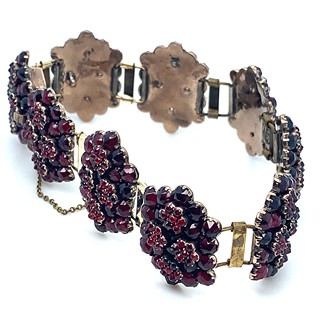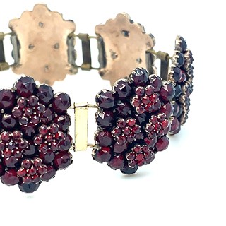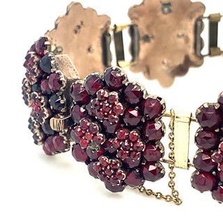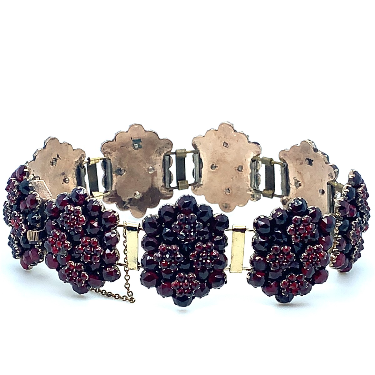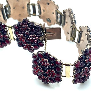 materiál tombak, hmotnost 30,10g, garance pravých českých granátů Turnov, vynikající barvy holubí krve, segmenty 23x18mm, mimořádný tvar a stav, muzejní šperk, Čechy 1840-50