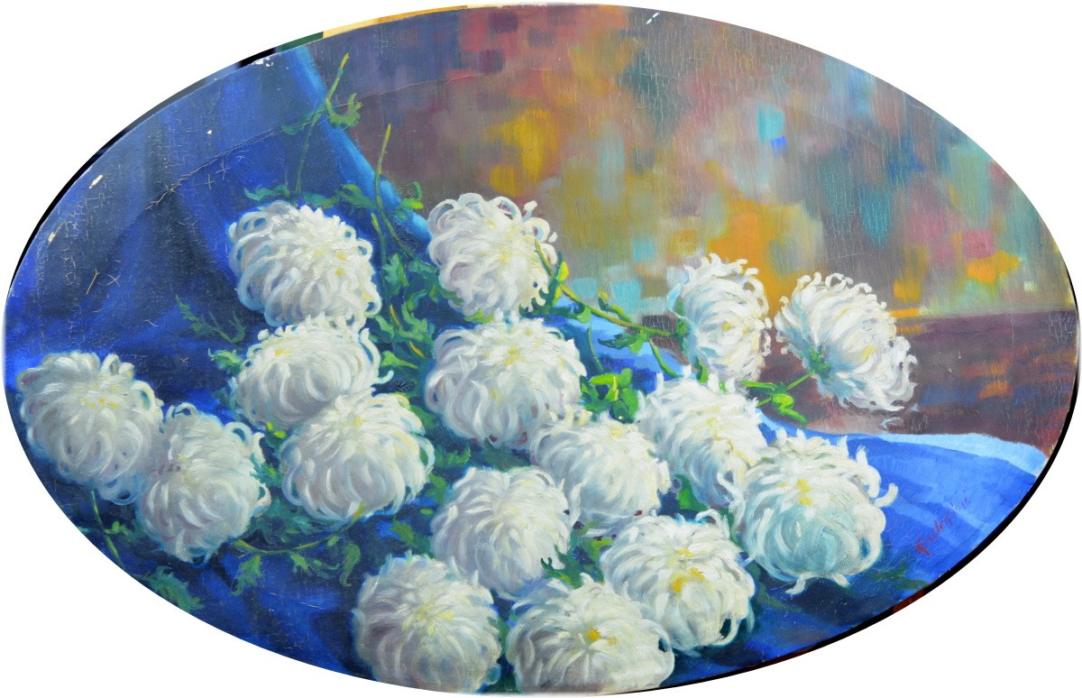 Chryzantémy, ol./plátno, ovál 65 x 50 cm, dat. 1931, místy krakelováno