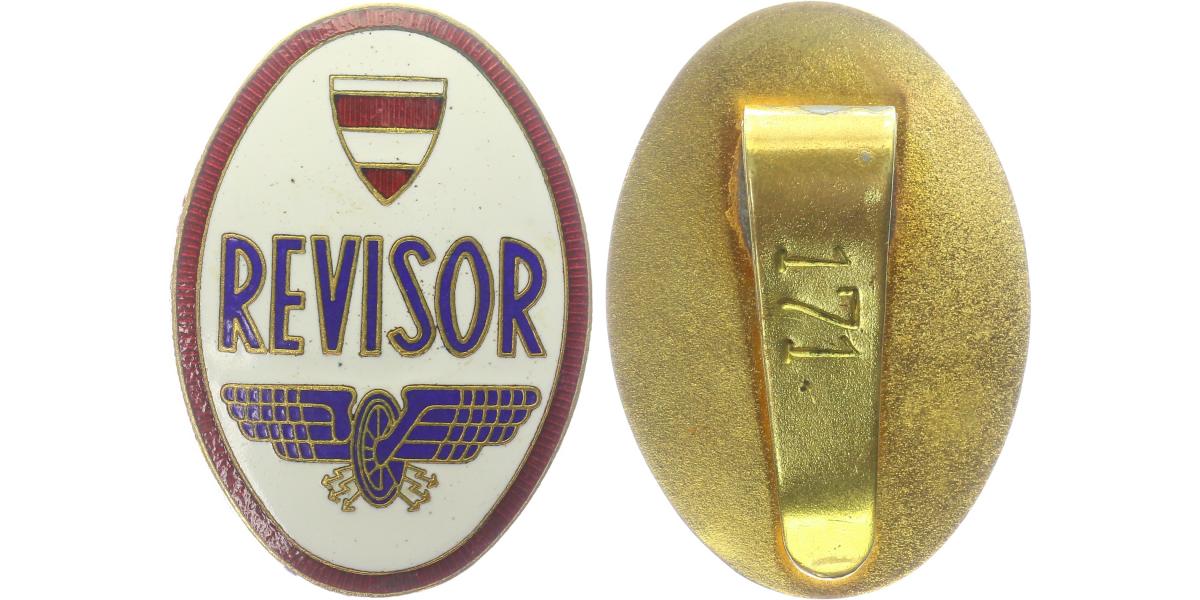 Brno - kontrolní odznak "Revizor". Smaltovaný zlacený bronz 37 x 52 mm, na rubu svislý úchyt s vyraženým číslem 171. Drobná vada amaltu.