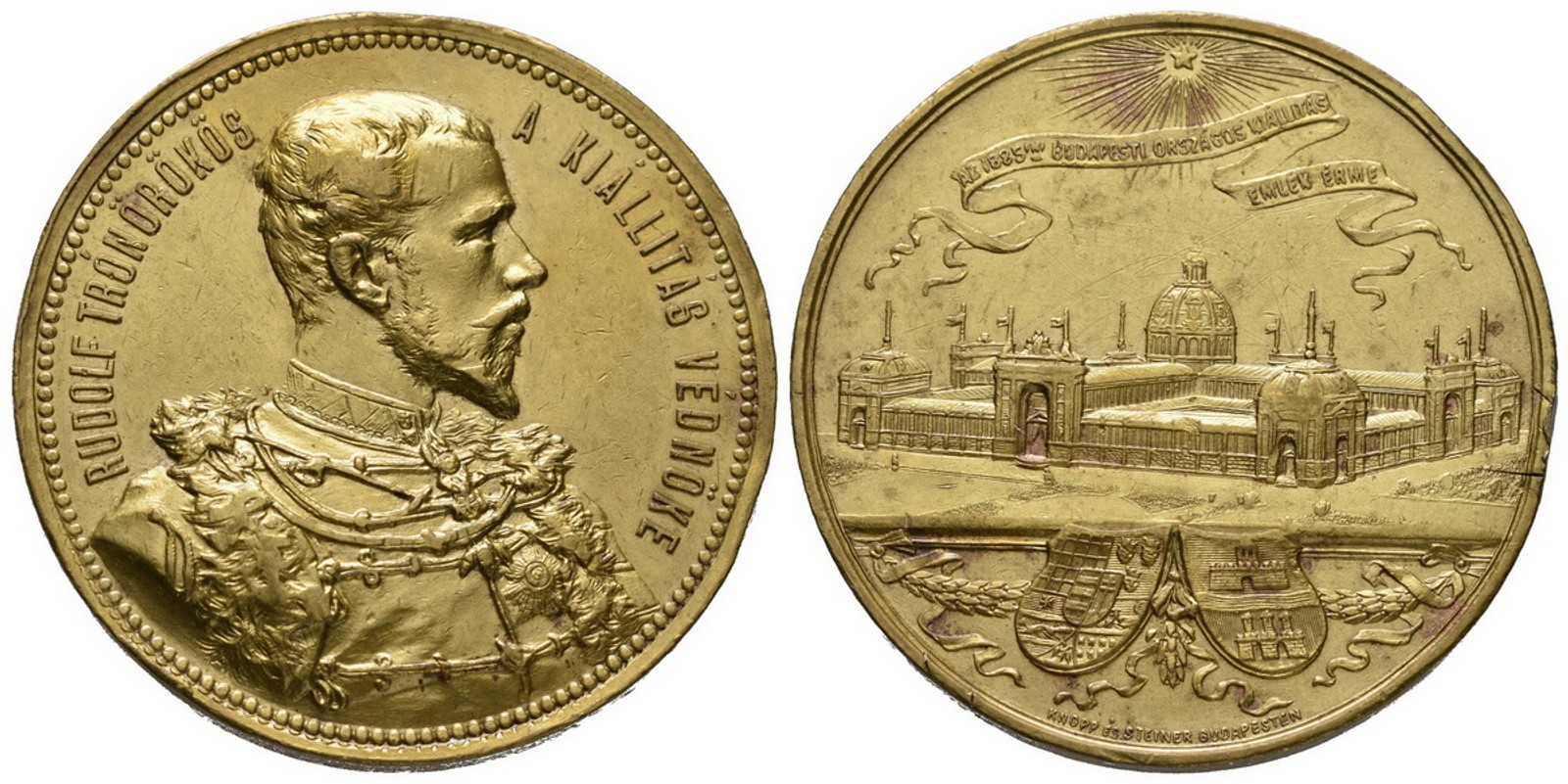 AE Medaile 1885 - Národní výstava v Budapešti pod záštitou korunního prince Rudolfa. Ms 38 mm, nep. hrany