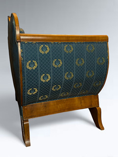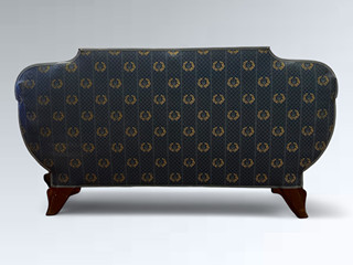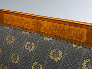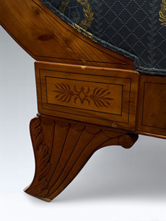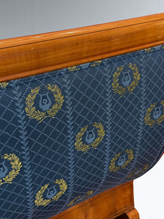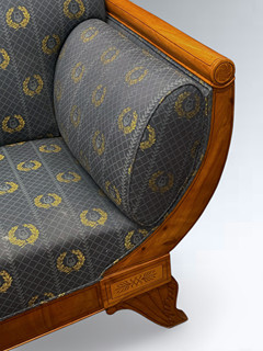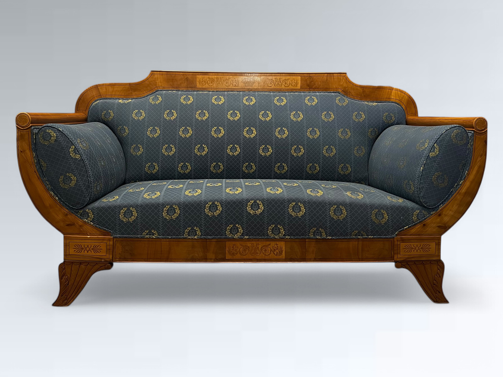 19. století - Velká biedermeier pohovka, dýha z třešňového dřeva, zdobené nohy, dekorativní motivy, nová modrá textilní potahová látka