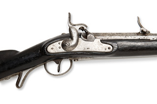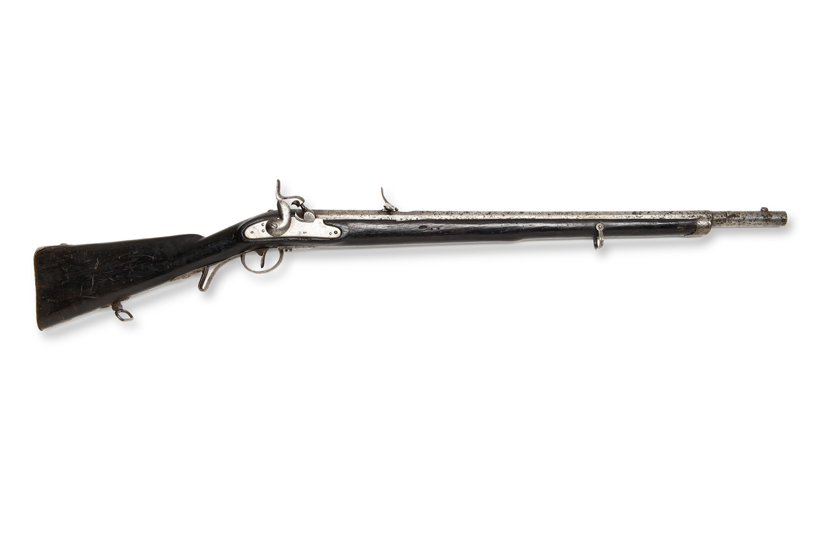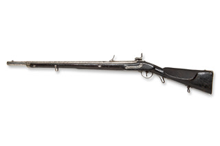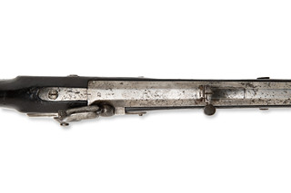 Myslivecký štuc vzor 1854, vyrobený v roce 1859. Na zámkové desce signatura "859," na hlavni označení "CP = Carl Pirko." Tradiční rakouská zbraň s drážkovanou hlavní pro přesnou střelbu. Kovové díly výrazně poškozeny korozí.