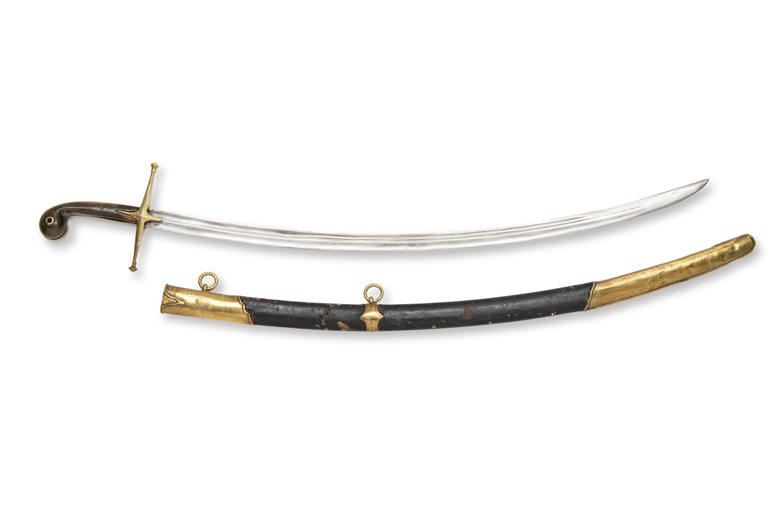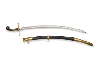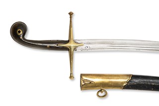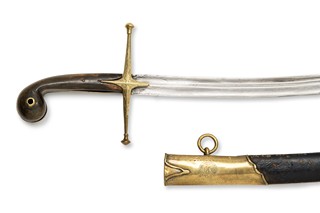 Turecká šavle typu šamšír z 1. poloviny 19. století, vyrobená v Turecku. Tento typ šavle, známý svou zakřivenou čepelí, byl tradičně používán v Turecku a dalších oblastech Blízkého východu. Šavle je s pochvou, která vykazuje stopy opotřebení, což naznačuje její dlouhodobé používání. Šamšír byla vysoce ceněná nejen pro svou funkčnost, ale i pro design, který byl navržen tak, aby byl efektivní v boji a zároveň esteticky přitažlivý.