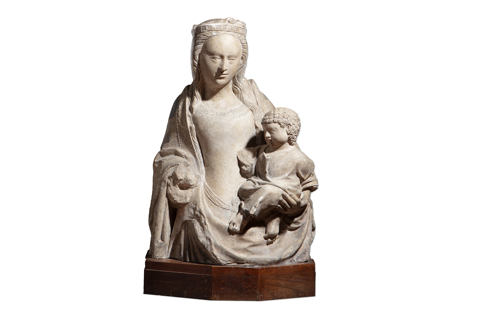 přelom 15. a 16. století | technika: vápenec (opuka). Madona sedící s korunou na hlavě drží na kolenou ježíška s knihou - tradiční ikonografie pozdní gotiky a rané renesance. stylizace tváří a drapérie nasvědčuje původu ve francii v 16. století. | výška 66 cm | poznámka: Osvědčení Národního památkového úřadu k trvalému vývozu
