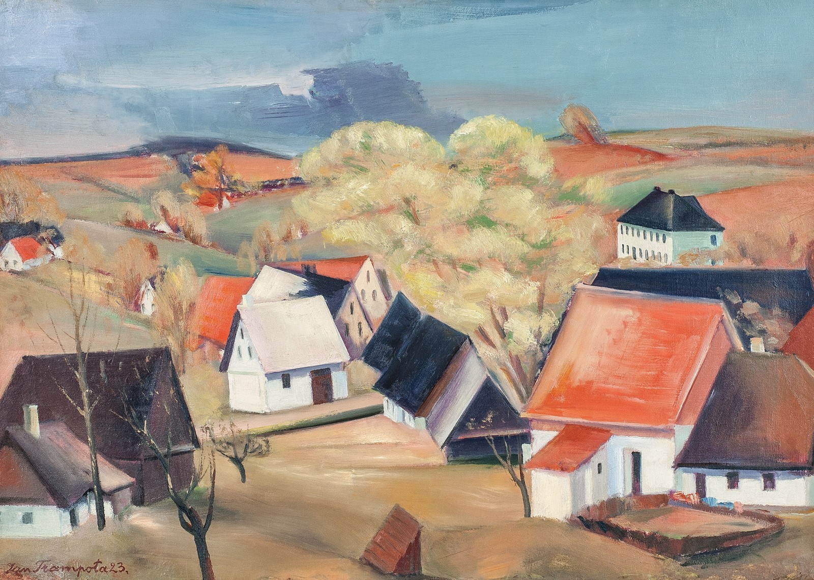 Vystaveno: Výstavní síň Mánes, Praha, 1927. Jan Trampota si ve své tvorbě prošel mnohými výtvarnými přístupy. Viděné dílo pochází z malířova expresivního, až fauvisticky raženého období. Autor zde předkládá divákovi pohled na jeho milované tvůrčí místo, a to Pěčín. Ten leží v podhůří Orlických hor, které malíř často pro náměty své malby navštěvoval. Kompozice plátna je vedena z nadhledu směřujícího zrakem do svažujícího se terénu, který je poset domy se stanovou střechou. Podoba domů je zgeneralizována v typickém Trampotově podání. Malíř zde nasadil svoji signifikantní měkkou malbu hutných barev, které podtrhují jiskrnost celého vidění. Plátno je rozděleno do jakých si provázaných plánů, kdy každý dům protíná jednu z linií. Takřka ve zlatém řezu díla malíř zapustil jemně zelenající se stromoví, které obzvláštňuje celou kompozici. V daném případě se Trampota vystříhal zobrazit typický pěčínský kostelík, který vystřídala jiná podstatná obecní budova, a to místní škola, vyvedená ve své bělostné kráse s podélně vedenými okny. V dáli plátna stoupá a klesá krajinný reliéf, barevně rozdělen danými polnostmi. A nad celou touto krajinou se tyčí modravé nebe, které zachycené krajině dodává na vzdušnosti a lehkosti bytí. Předložené dílo Jana Trampoty datované do výtečných dvacátých let obsahuje vše, na co jsme u malířových nejlepších prací zvykli, ba co víc, lze tvrdit, že dané plátno je jedním z nejlepších kusů autorem nabízených za poslední dobu k prodeji. Obdobná díla se na našich a dalších prestižních aukcích draží v rozmezí 150 000 – 200 000 CZK.