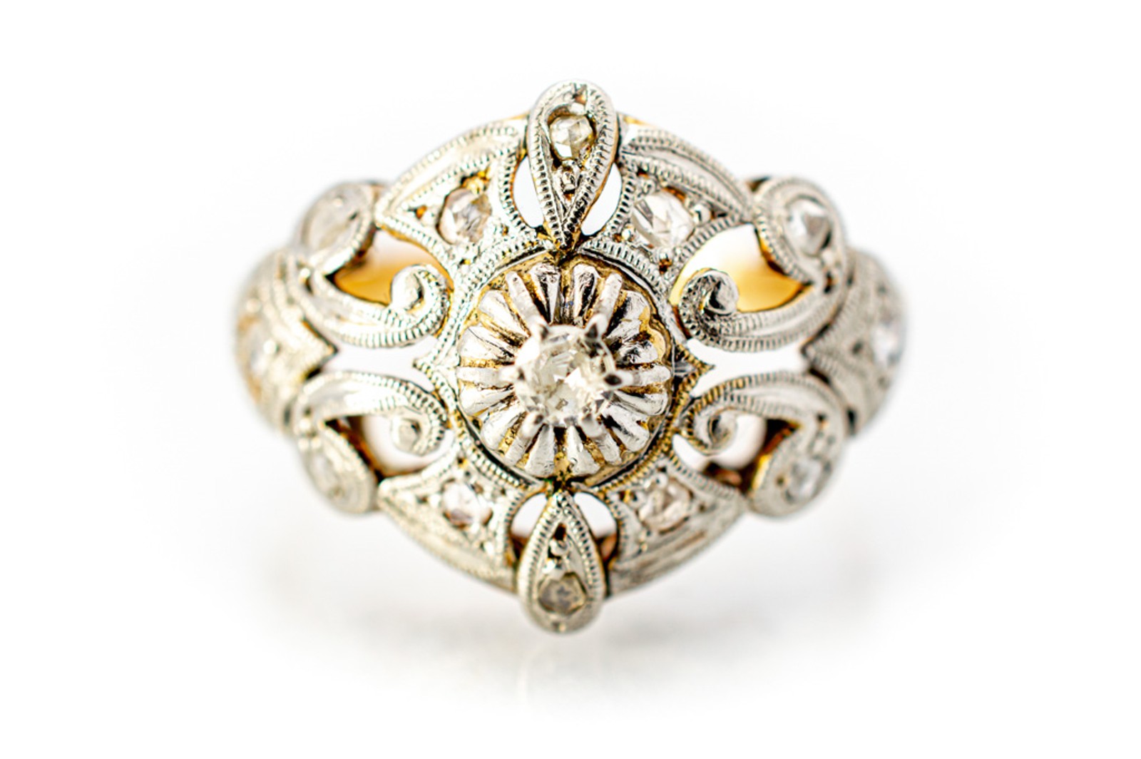 Prsten v kombinaci bílého a žlutého zlata o ryzosti 585/1000, váha 3,45 g, celkem 13 diamantů cca 0,4 ct, velikost 55.