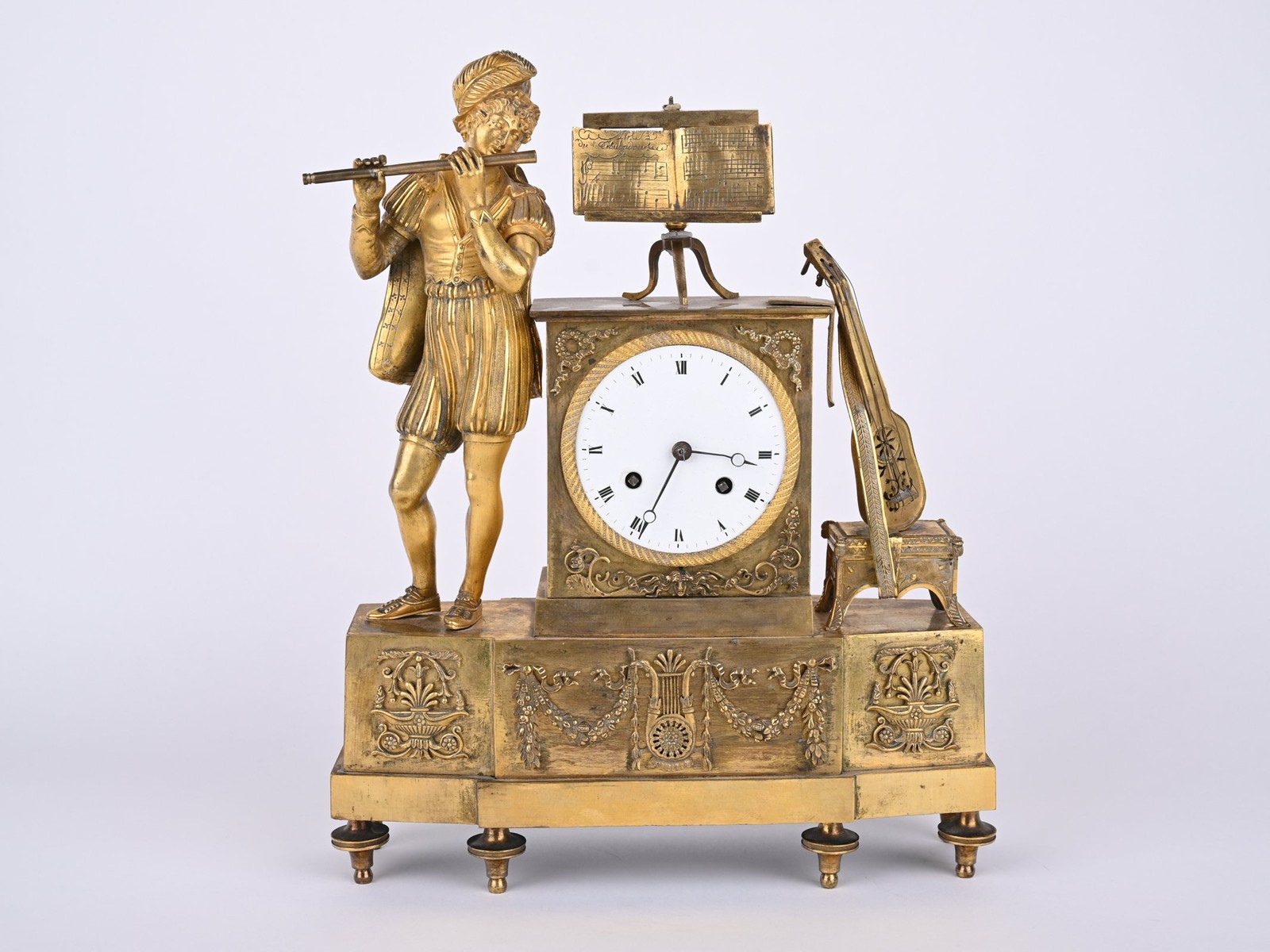 Typická ukázka kvalitního bronzařského řemesla ve Francii v době empíru. Bohatě zdobené na podstavci, na kterém stojí zpěvák s píšťalou a opřenou loutnou. Nad smaltovaným ciferníkem s římskými číslicemi stojan s partiturou. Dobrý stav bez známek poškození.