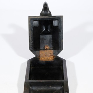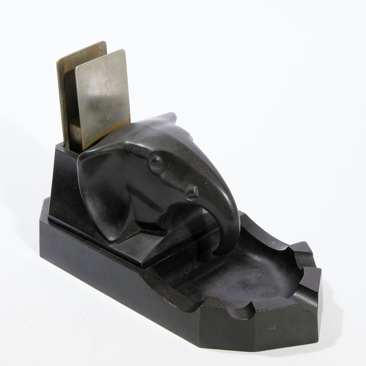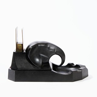 20 x 9,5 x 12,5 cm, kolem r. 1930, produkce Továreň na káble - závod Gummon, Bratislava, Slovensko, značeno, model č, 2744, bakelit, kov, rez na pantu, 3 minioťuky vzadu zespodu. Ref.: https://scd.sk/dielo-smd/popolnik-slon/ .