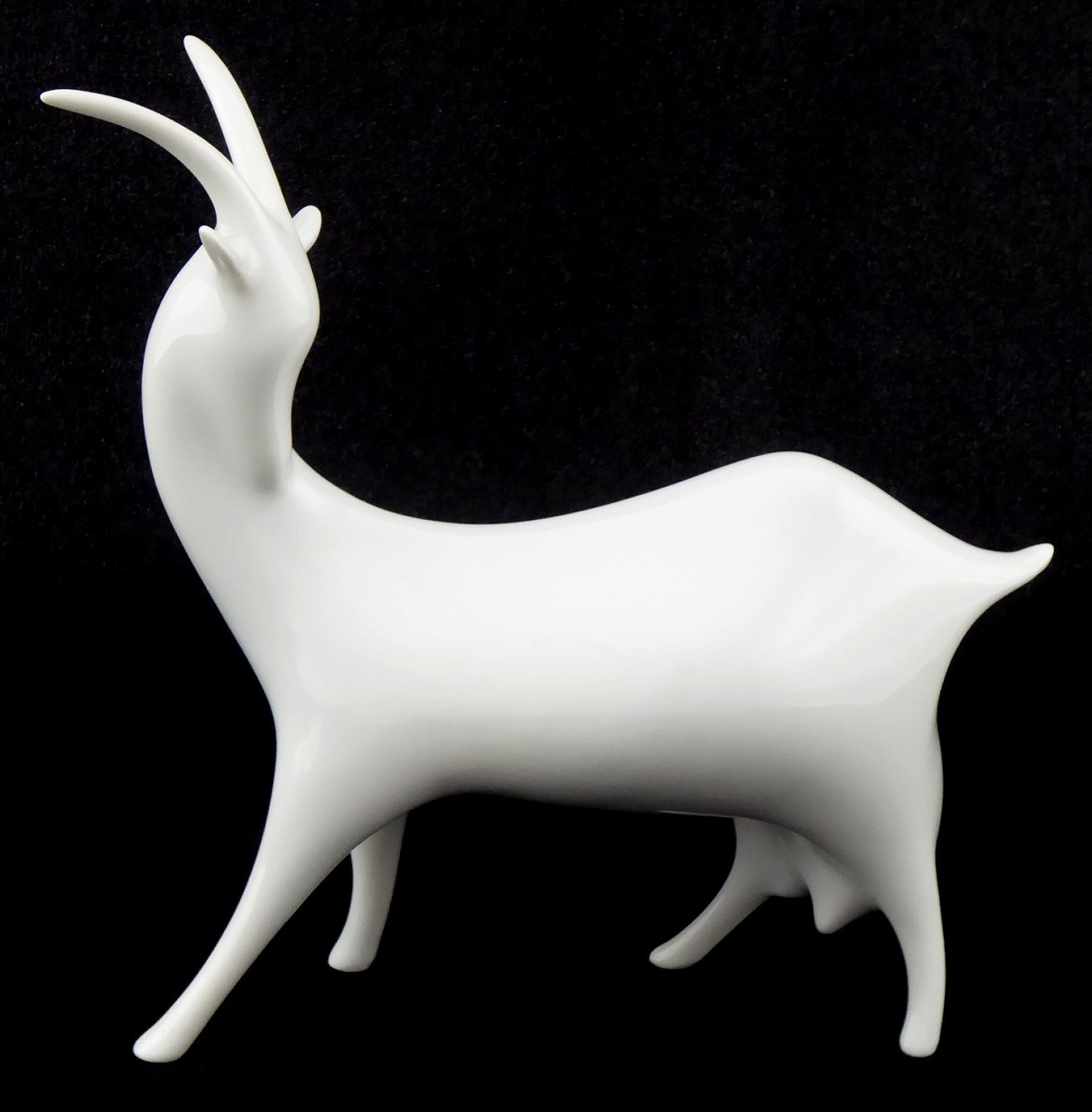 Československo, Duchcov Bílý porcelán Autor modelu Jaroslav Ježek ( 1923-2002 ) Rok 1959 Vystaveno na XII. Trienále v Miláně rok 1960. Období a styl Brusel. Soška stojící kozy s otočenou hlavou směrem dozadu. Neznačeno. Výška 17,5 cm. Šířka 17,5 cm.