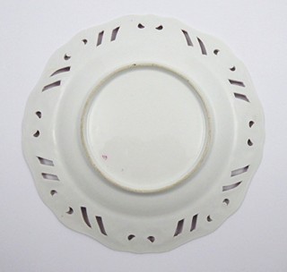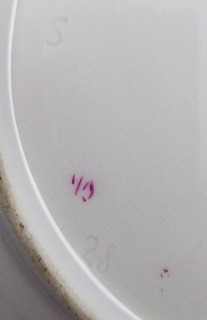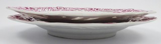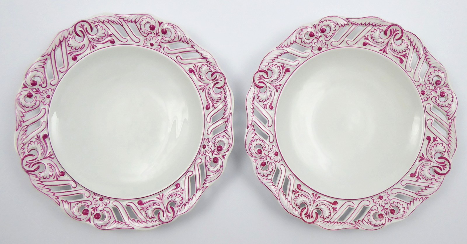 Čechy, Slavkov (Schlaggenwald) 1840 - 1870. Bílý, purpurově ručně malovaný porcelán. Slavná porcelánka ve Slavkově. Průměr obou talířů: 24 cm. Dva talíře s reliéfním prolamovaným okrajem ručně zdobené barvou purpurového odstínu s florálním dekorem. Značeno zespodu: vtlačené písmeno S a čísla a malované číslo malíře.