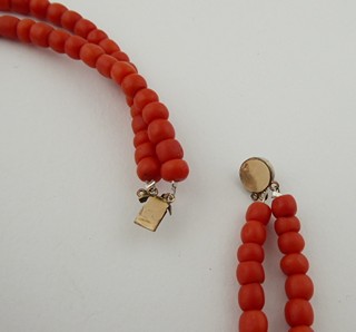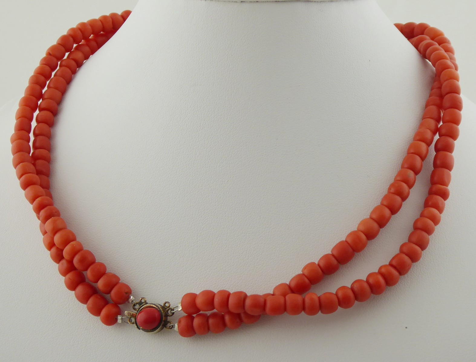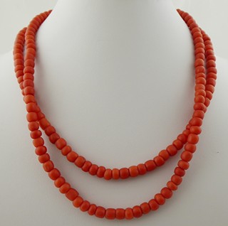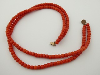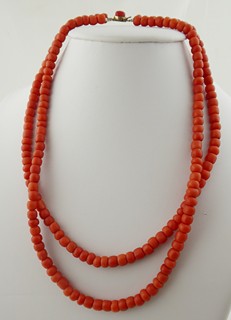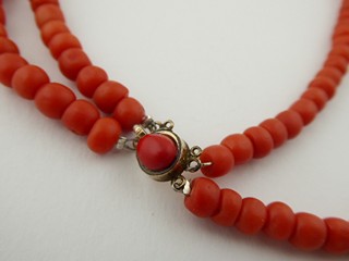 Jižní Evropa 1870 - 1920. Zlacený kov, přírodní mořské korály. Délka náhrdelníku 430 mm. Náhrdelník z přírodních mořských korálů s dvojitou šňůrou spojenou pozlaceným zdobným uzávěrem korunovaným sytě červeným korálem.