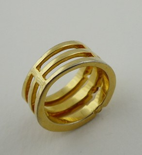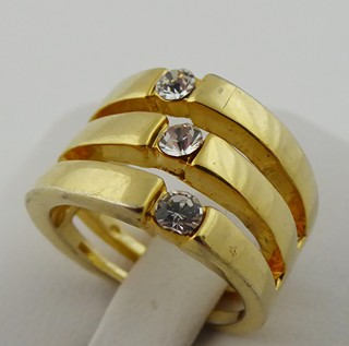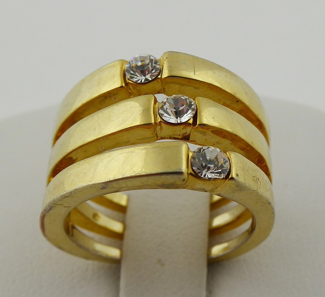 Evropa, třetí třetina minulého století. Zlacený kov, sklo. Velikost prstenu 52. Výrazný prsten ze zlaceného kovu tvořený třemi spojenými obroučkami, které zdobí skleněné broušené kamínky.