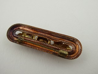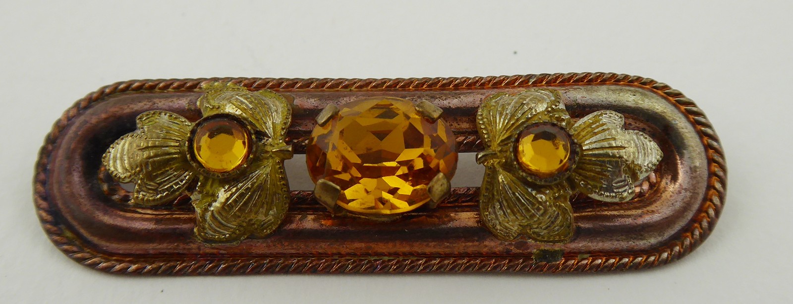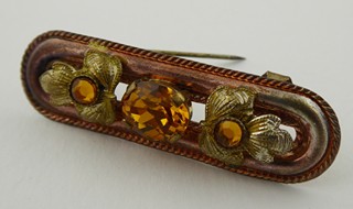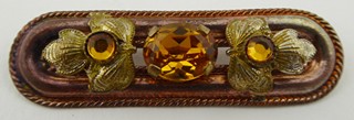 Čechy, Jablonecko 1900 - 1940. Kov s bronzovou patinou a skleněné broušené kamínky. Rozměr brože: 47 mm x 15 mm. Působivá brož z kovu s patinou zdobená po obvodu kroucenými drátky ohraničujícími reliéfní květiny se středy ze skleněných sklíček a centrálním skleněným broušeným kamenem, vše v žlutě jantarové barevnosti. Ve starožitné etui.