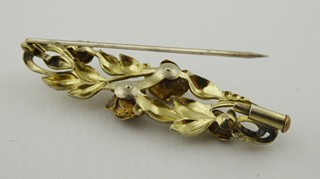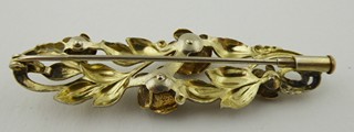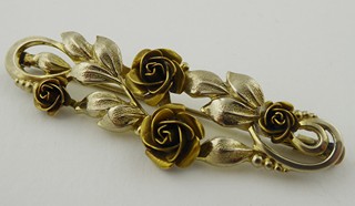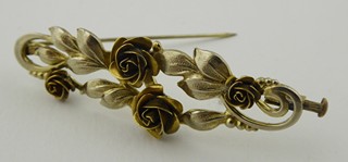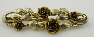 Čechy 1900 - 1930. Žlutý kov, místy stříbřený. Rozměr brože: 55 mm x 20 mm. Brož v podobě spony dekorované stříbřenými květy růže s listy a úponky. V krabičce.