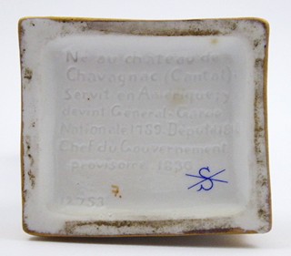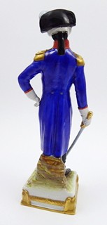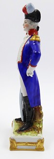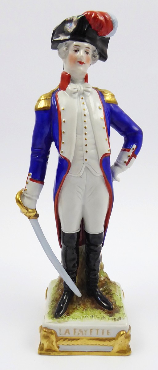 Německo, Scheibe-Alsbach 1925-1972. Bílý, ručně barevně malovaný a zlacený porcelán. Porcelánka Scheibe-Alsbach. Výška 25 cm. Porcelánová figura francouzského generála: Gilbert du Motier, markýz La Fayette (1757-1834). Markýz se podílel na americké válce za nezávislost a byl blízkým přítelem George Washingtona. La Fayette je zde zachycen v generálské vojenské uniformě se šavlí v ruce. Ručně barevně malováno i zlaceno. Na stylizovaném podstavci čtvercového tvaru se zlatými ozdobami a nápisem: LA FAYETTE. Značeno zespodu: písmeno S, značka malíře a vtlačené informace o samotném generálovi.