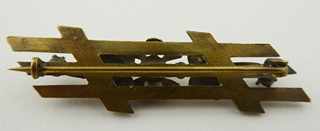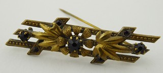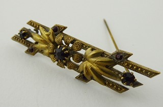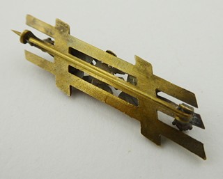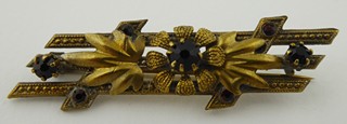 Čechy, zřejmě Jablonecko 1890 - 1930. Žlutý kov a skleněné kamínky napodobující granáty. Rozměr brože: 55 mm x 17 mm. Brož ze žlutého kovu s patinou se stylizovaným reliéfním květem zdobená skleněnými broušenými kamínky granátové barevnosti.