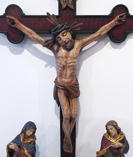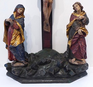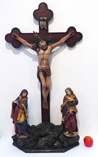 Střední Evropa 1800 - 1890. Dřevořezba, polychromie, zlacení. Rozměry: výška 119 cm, šířka 66 cm a hloubka 27 cm. Přiloženo osvědčení Národního památkového ústavu České republiky. Prostorově velmi výrazná polychromovaná dřevořezba. Středem zobrazení scény ukřižování Ježíše Krista je kříž s jetelovými zakončeními břeven. Kříž je zasazen do podstavce se zkosenými předními rohy. Povrch podstavce imituje kamenitý terén. Korpus Krista je přibit na tři hřeby. Kristus má zavřené oči, jeho obličej lemuje tmavý plnovous. Hlava svěšená k pravému rameni. Kolem hlavy s trnovou korunou září paprsky svatozáře a nad hlavou je umístěn svislý svitek s dvouřádkovým nápisem INRI. Pod křížem stojí asistenční postavy v podobě Panny Marie Bolestné ve světle karmínovém spodním šatu a tmavomodrém plášti se zlatým rubem a dále postava svatého Jana Evangelisty v zeleném spodním šatu a karmínovém plášti lemovaném zlacením.