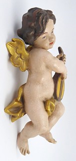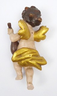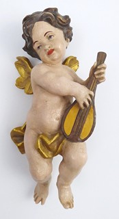 Střední Evropa, minulé století. Dřevořezba, polychromie, zlacení, patina. Výška 34 cm. V barokním stylu. Přiloženo osvědčení Národního památkového ústavu České republiky. Dřevořezba andílka hrajícího na loutnu, kdy andělova hlava s výraznými hnědými kudrlinkami a buclatou tváří s ručně malovaným obličejem je skloněna přes pravé rameno. Nahý anděl má přes bedra uvázanou zlacenou roušku. Vysoce stylizovaná zlacená křidélka jsou rozevřena a loutnu má opřenou o stehno levé nohy. Dřevořezba je plně plastická.
