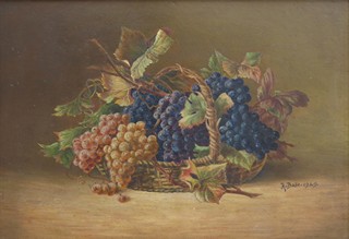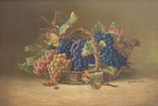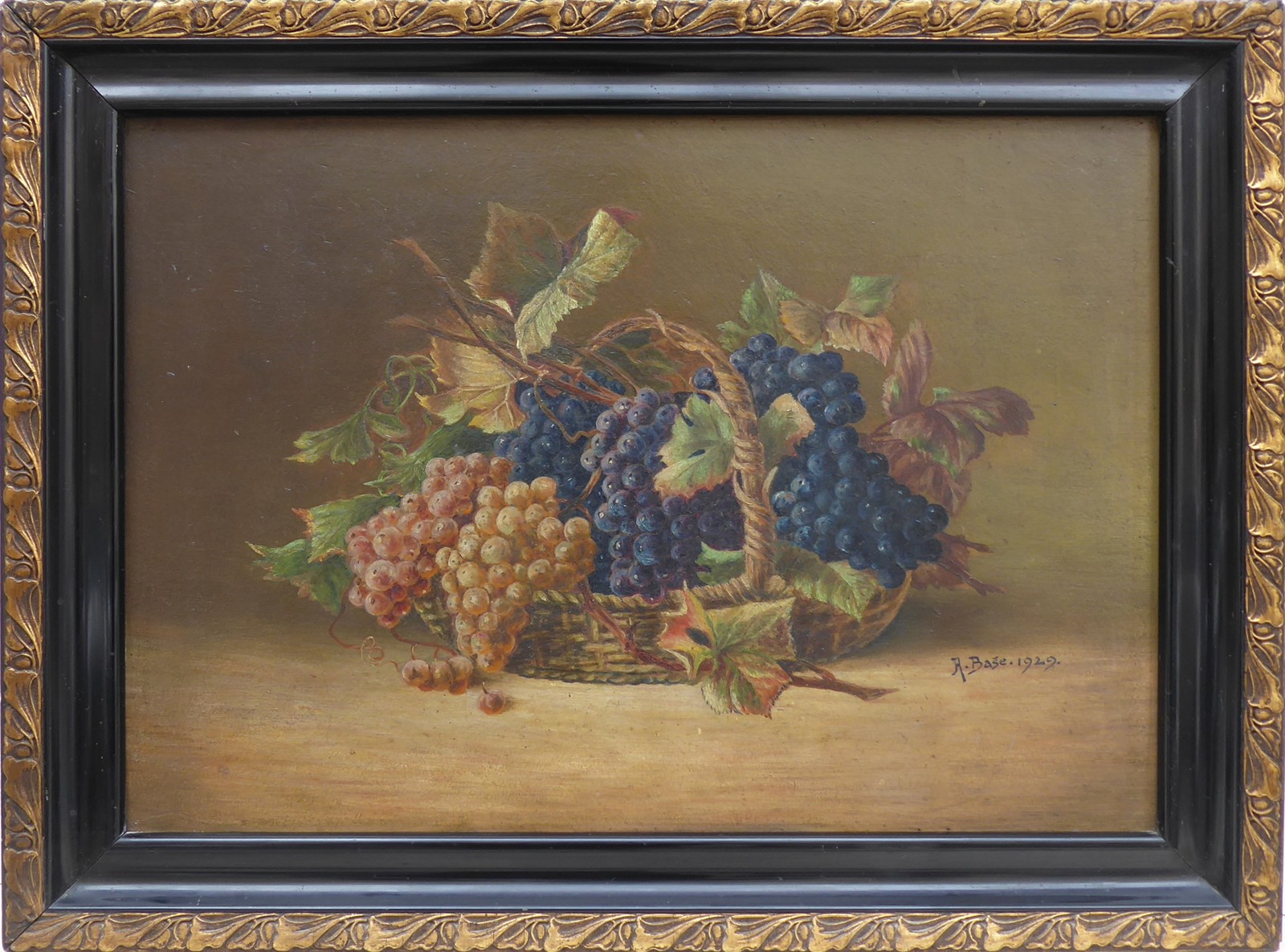 Československo, rok 1929. Olej na kartonu 35 cm x 50 cm. Signováno vpravo uprostřed s datací 1929. Celkový rozměr s rámem 43,5 cm x 57,5 cm. Zátiší s různobarevnými hrozny vinné révy s listy a úponky v proutěném košíku. Rám se zlatým secesním ornamentem a černou leštěnou vnitřní plochou.
