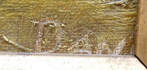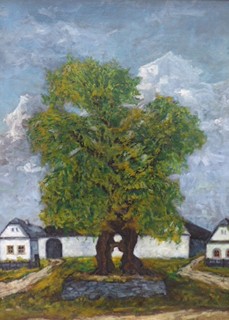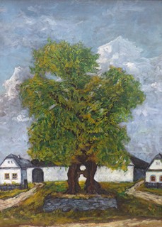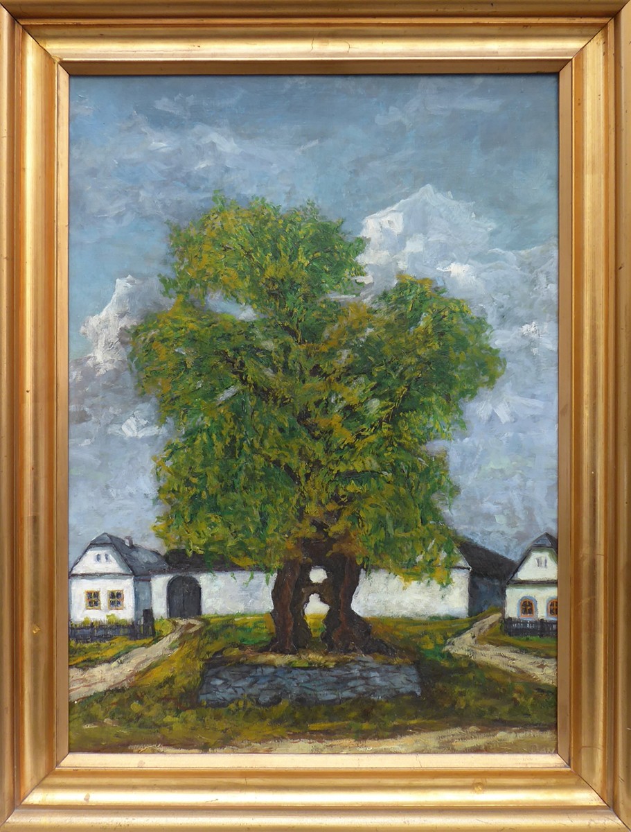 Československo, minulé století. Olej na plátně 75,5 cm x 55,5 cm. Signováno vpravo dole. Celkový rozměr s rámem 85 cm x 65 cm. Venkovská náves s mohutným stromem a malým jezírkem na rozměrnější olejomalbě. Zlatý profilovaný rám.