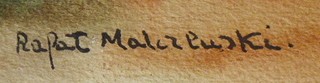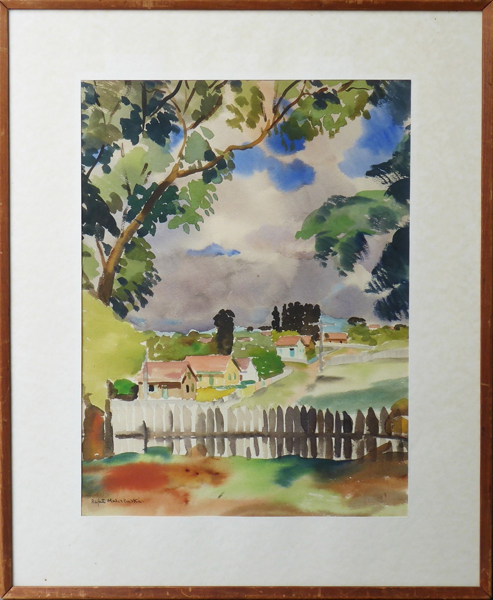 Polsko nebo Kanada, 30. až 50. léta minulého století. Akvarel na papíru 45,5 cm x 34 cm. Signováno vlevo dole. Vzadu razítko galeristy či rámaře: HENRI MORISSET, OTTAWA, ONT. Autor: Rafal Malczewski (1892-1965). Celkový rozměr s rámem 62,5 cm x 51,5 cm. Malebný pohled na krajinu s rozesetými domky. Ve světle hnědém úzkém rámu s paspartou a sklem.