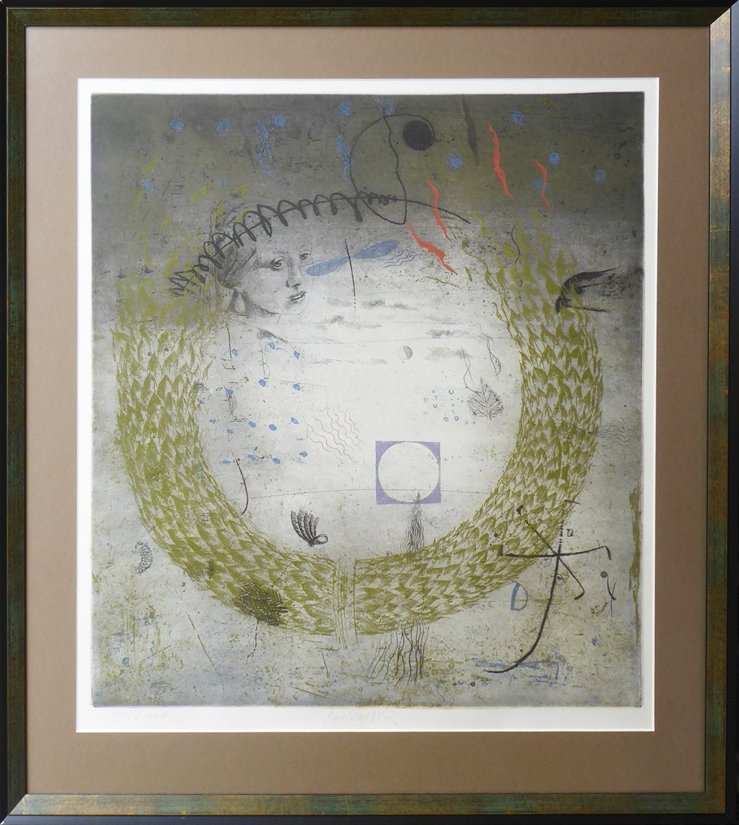 Československo, třetí třetina minulého století. Kombinovaná technika, barevný lept na papíru 53 cm x 48 cm. Signováno tužkou dole uprostřed. Vlevo dole tužkou ručně psané: Vytiskl autor. Autor: Pavel Sukdolák (1925-2022). Ve stylovém rámu s paspartou a sklem 71,5 cm x 63,5 cm.