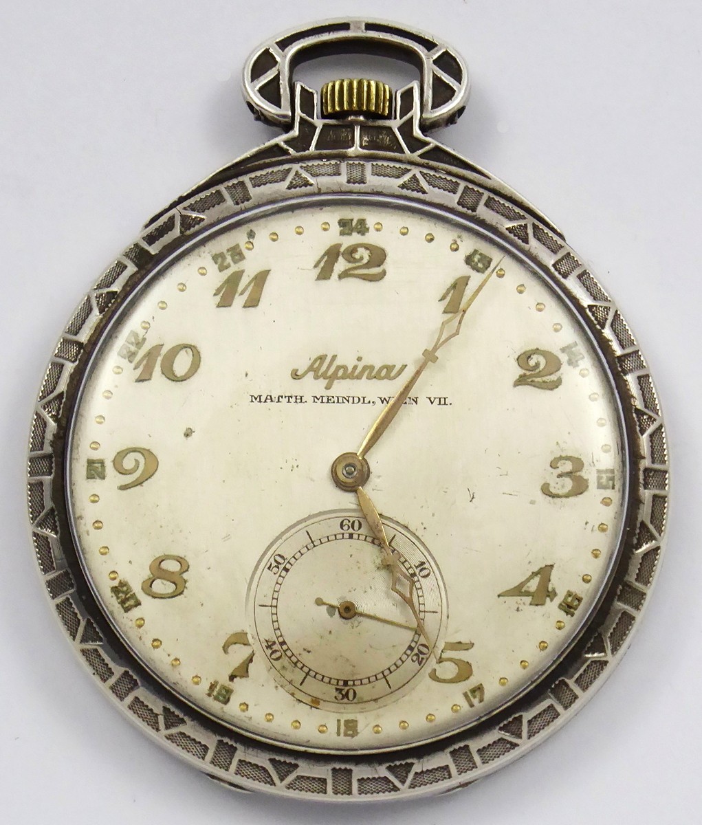 Rakousko, Vídeň 1910 - 1930. Stříbro. Ryzost Ag 900/1000, celková hmotnost 52.93 g. Průměr 50 mm. Dvouplášťové stříbrné kapesní hodinky. Plášť číslovaný se značkou výrobce Alpina, ryzost 900, švýcarský a německý punc. Hodinový stroj zn. Alpina, číslo 325. Stříbřitý ciferník s reliéfními číslicemi, zlatými ručičkami a vteřinovkou. Ciferník značený Alpina a jménem prodejce MATTH. MEINDL, WIEN VII. Funkční. Vzhledem ke stáří hodinek bez záruky přesnosti chodu a dlouhodobé funkčnosti.