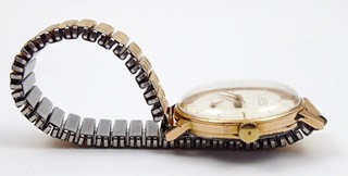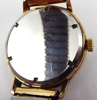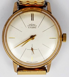 Československo, rok vzniku 1964. Zlacené pouzdro, obecný kov - náramek. Náramkové hodiny značky PRIM. Typové označení: 500953. Zlacené pouzdro z Francie, průměr pouzdra 33,7 mm. Šroubovací víko. Číslované 1153139. Kovový náramek. Funkční. Vzhledem ke stáří hodinek bez záruky přesnosti chodu a dlouhodobé funkčnosti.