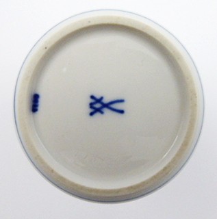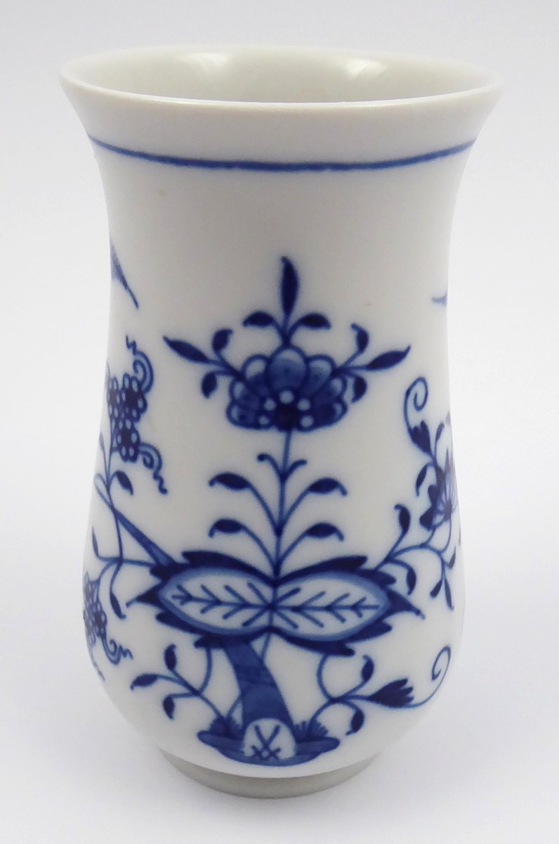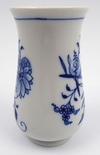 Německo, minulé století. Bílý a ručně kobaltovou modří malovaný porcelán. Porcelánka Míšeň. Výška 11 cm. Nízká vázička z míšeňského porcelánu dekorovaná kobaltovou modří tzv. cibulák. Značeno zespodu: modré zkřížené meče a čísla.