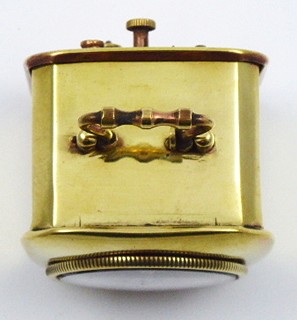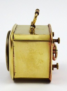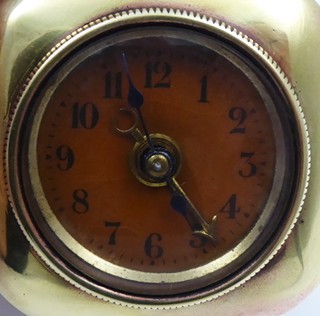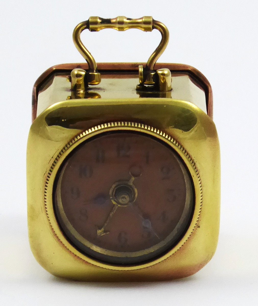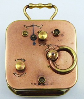 Německo 1900 - 1940. Mosaz. Výška bez úchytu 4,8 cm. Malý cestovní budík s černými číslicemi a modřenými ocelovými ručičkami. Mosazná zdobná ručička budíku. Vzadu značený D.R.P. & G.M. na měděném povrchu, což jsou německé patentové značky. Funkční. Vzhledem ke stáří budíku bez záruky přesnosti chodu a dlouhodobé funkčnosti.