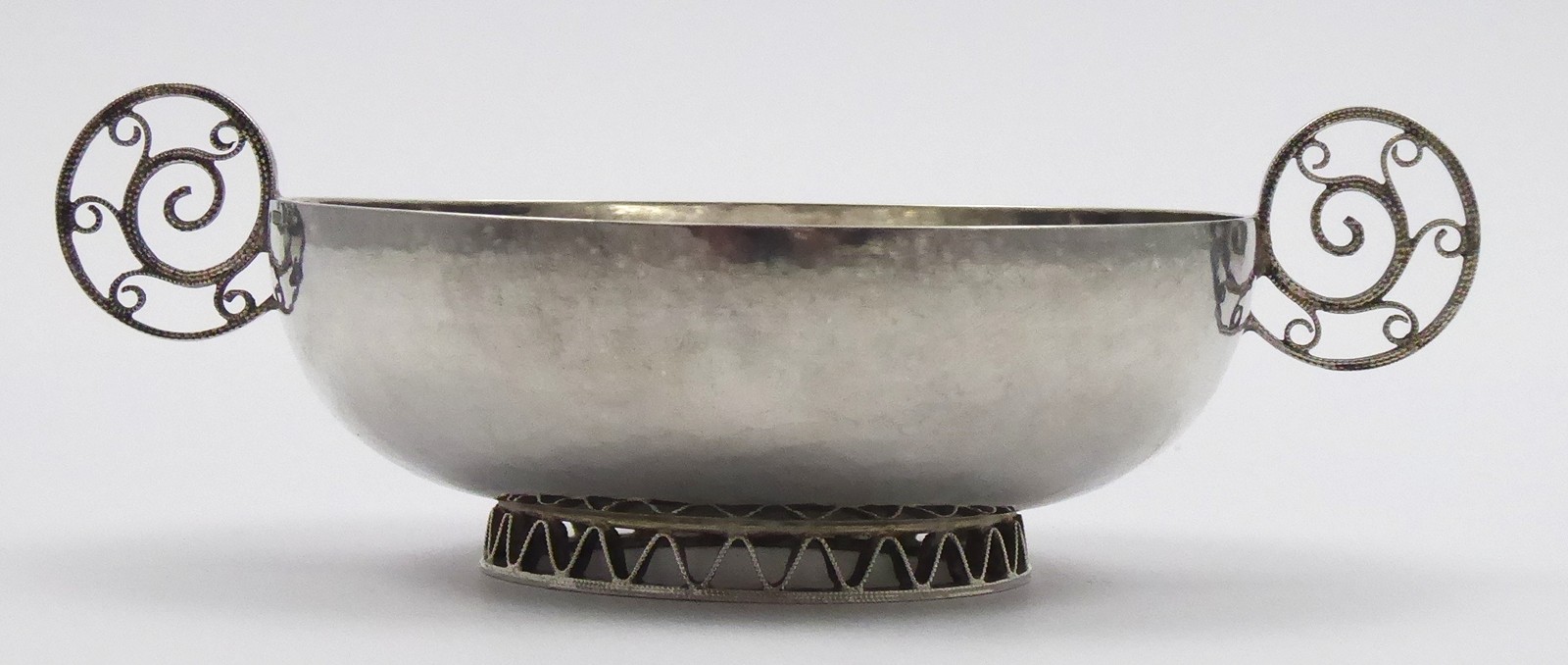Švýcarsko, Luzern, 20. až 30. léta minulého století. Stříbro. Ryzost Ag 925/1000, celková hmotnost 124,87 g. V románském historizujícím stylu. Autorem slavný ateliér Bossard patřící mezi nejvýznamnější švýcarské zlatníky a stříbrníky, jehož klientelou byla stará evropská šlechta, bohatí průmyslníci i obchodníci. Průměr 15 cm. Tepaná miska ze stříbra vysoké ryzosti tvarovaná románském historizujícím stylu. Spirálovitě stáčené úchyty s jemným ornamentem. Kruhová základna s prolamovaným tvarem. Vysoce kvalitní ruční řemeslné zpracování. Značeno: BOSSARD, mistrovská značka s erbem, ryzost 925 a nově označeno platným českým puncem.