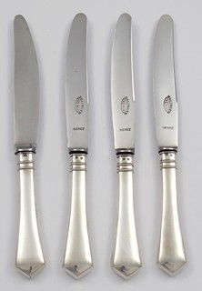 Československo 1929 - 1940. Období a styl: art deco. Stříbro a nerezová ocel zn. Solingen EK. Ryzost Ag 800/1000, celková hmotnost 241,45 g. Délka 21,5 cm. Čtyři art deco jídelní nože s celostříbrnou profilově tvarovanou rukojetí zakončenou v horní části prstenci a v dolní stylizovaným monogramem. Čepele z nerezové oceli značené nápisy: SOLINGEN EK NEREZ. Značeno: mistrovská značka, československý punc Tatry a kříž, znaménko ryzosti 800.