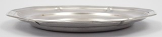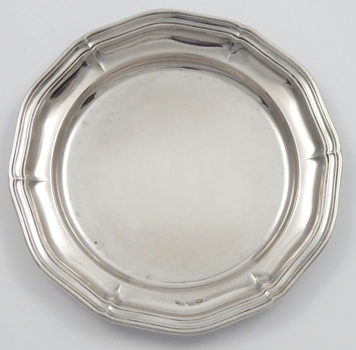 Slovenský štát, Dolné Hámre 1939 - 1945. Stříbro. Sandrik, Dolné Hámre. Ryzost Ag 800/1000, celková hmotnost 112,55 g. Průměr 14,5 cm. Elegantní malý kulatý stříbrný tác s reliéfně klenutým okrajem a žebrováním. Značeno: československý punc pro cizí zboží lilie, ryzost 800 a značka výrobce rozeta.