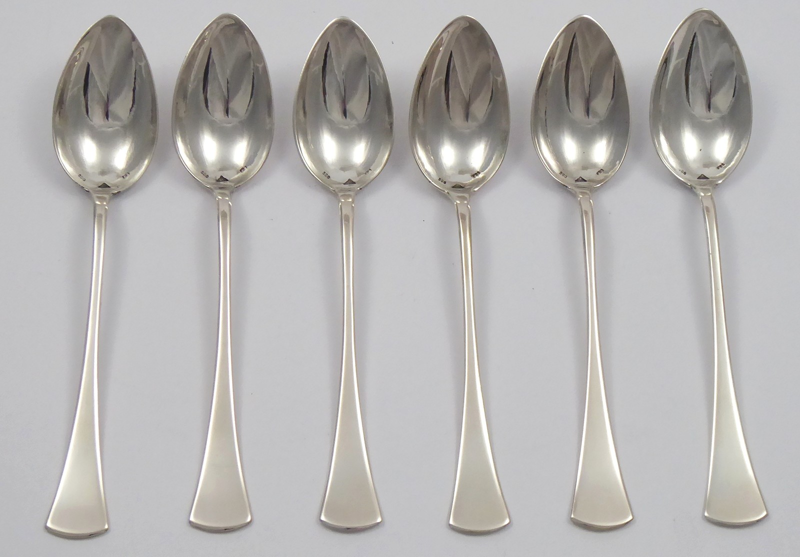 Československo, Praha 1929 - 1949. Období a styl: art deco. Stříbro. Pražská stříbrnická firma Josefa Borovičky mladšího, jehož mistrovskou značku po jeho skonu od roku 1926 používala jeho vdova. Ryzost Ag 800/1000, celková hmotnost 85,95 g. Délka lžiček 14 cm. Šest stříbrných art deco čajových či kávových lžiček s fazetami a rukojeťmi s vějířovitým zakončením. Značeno: československý punc trojvrší s křížem, ryzost 800 a mistrovská značka.