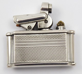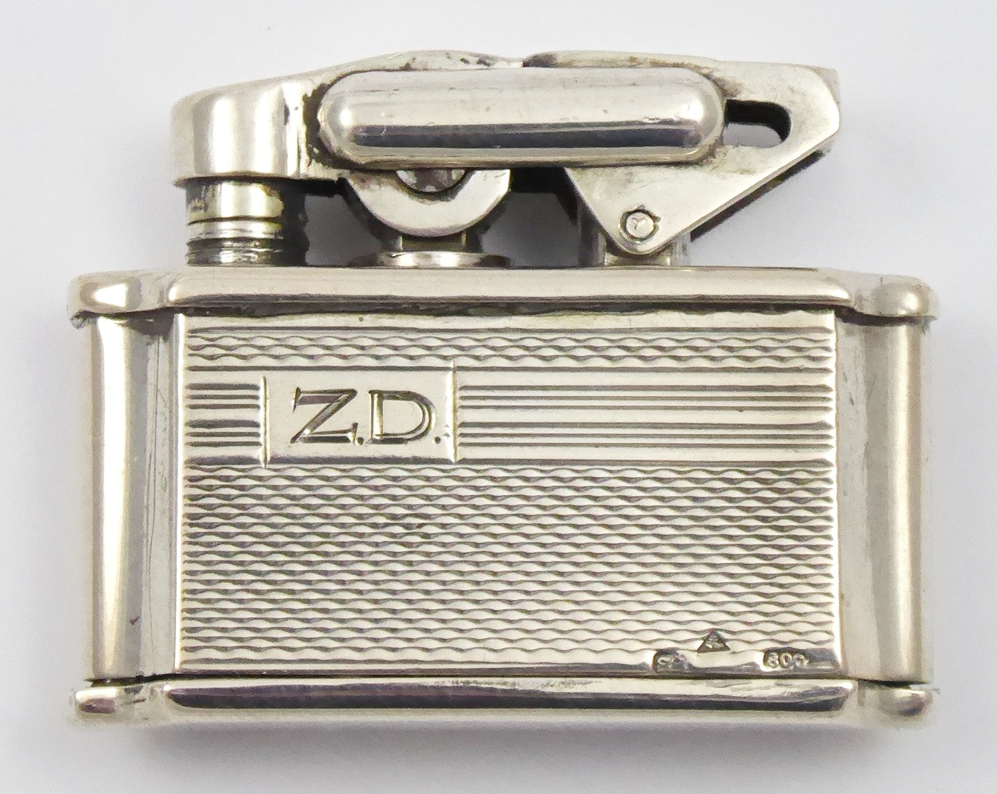 Československo 1929 - 1949. Stříbro, bílý kov. Ryzost Ag 800/1000, celková hmotnost 27,45 g. Rozměr: 4 cm x 3 cm. Malý zapalovač se stříbrným pláštěm dekorovaným gilošováním a gravírovaným monogramem ZD. Tělo zapalovače z bílého kovu. Značeno: československý punc trojvrší s křížem, mistrovská značka a znaménko ryzosti 800.
