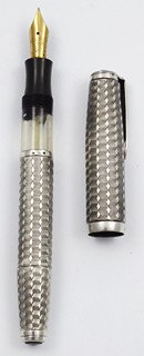 Československo, od roku 1949. Stříbro. Ryzost Ag 835/1000, celková hmotnost 33,60 g. Délka 13,5 cm. Stříbrníci bratři Šilhánové sdružení pod podnikem Soluna Praha. Masivní stříbrné pero BARCLAY 1302 s psacím hrotem ze zlacené nerezové oceli RIPEDIUM POINT 60 od firmy Ripet, České Budějovice. Dolní šroubovací část pera ukrývá tlačítkové pero na stlačování inkoustu uvnitř v gumovém zásobníku. Povrch pera je dekorovaný pomocí jemné techniky gilošování. Značeno: československý punc kamzík, znaménko ryzosti 835 a mistrovská značka Soluna - bratři Šilhánové.