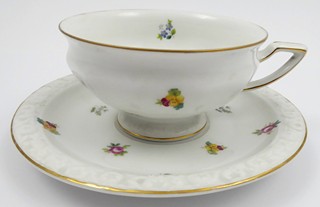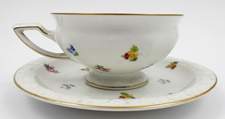 Německo, Selb 1930 - 1931. Bílý, barevný a zlacený porcelán. Autor návrhu: Philipp Rosenthal (1855-1937). Název modelu: Maria. Porcelánka Rosenthal. Výška šálku 5,5 cm, průměr podšálku 16 cm. Čajový šálek s podšálkem zdobené jemným reliéfním ornamentem, zlacenými linkami a barevnými svazečky lučního kvítí. Značeno zespodu: firemní značka Rosenthal, SELB - BAVARIA, MARIA a zlacenými čísly.