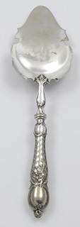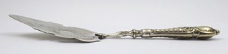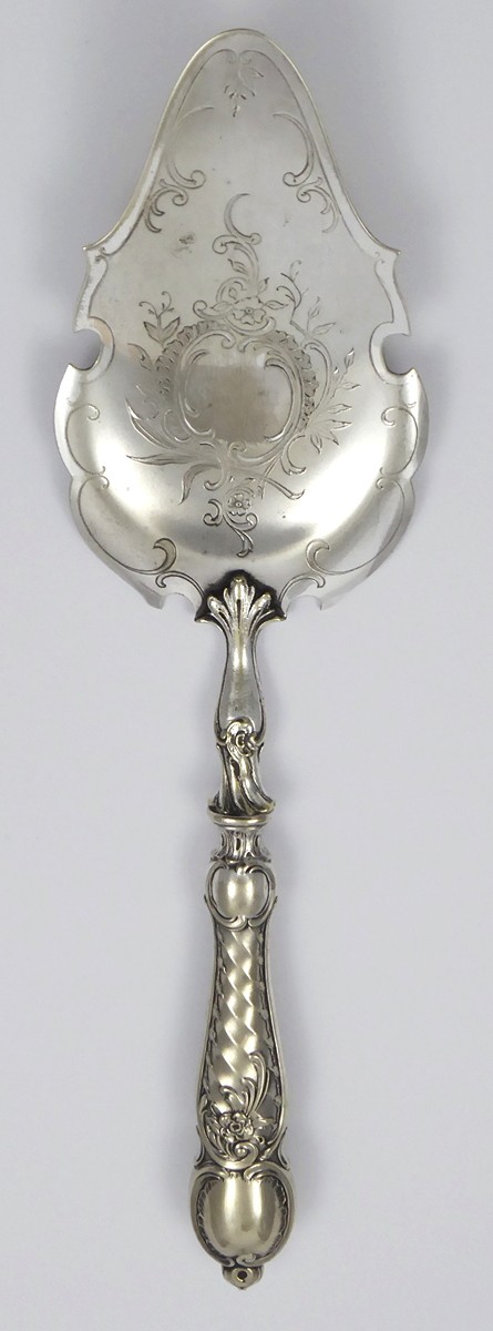 Rakousko-Uhersko, Vídeň 1880 - 1914. Postříbřený kov (alpaka). Celková hmotnost 128,70 g. Firma Albert Köhler & Cie, Wien (filiálka WMF). Délka 30 cm. Stříbřená lopatka na dorty, dezerty a jiné pochutiny bohatě zdobená gravírováním a reliéfně tvarovaným okrajem i rukojetí. Značeno: K & Co.