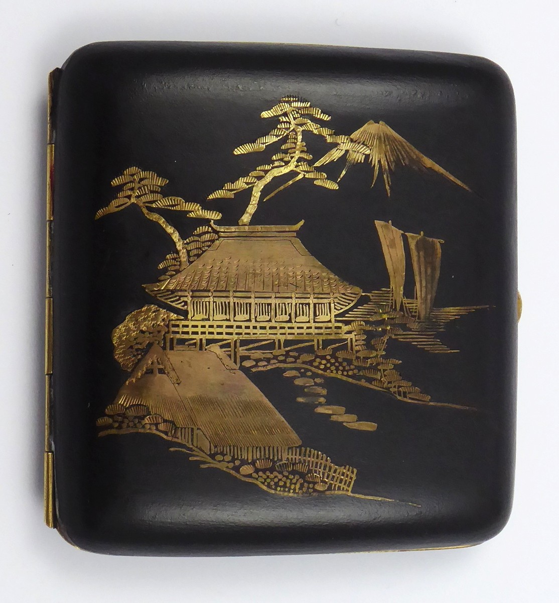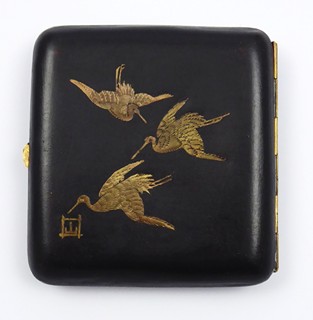 Japonsko, Kjóto, perioda Meiji (Meidži) 1868 - 1912. Kov, technika tausování s 24 karátovým zlatem a stříbrem. Rozměr: 9 cm x 8,5 cm. Exkluzivní japonské cigaretové pouzdro vyrobené damascénskou technikou z období Meiji (Meidži) z let 1868 - 1912. Damascénská technika zdobení kovů je starobylá technologie orientálního původu. Spočívá mimo jiné v technologii povrchové úpravy kovu zlatým nebo stříbrným dekorem. Výrobce: Otojiro Komai (1842-1917) založil koncem 19. století rodinnou dílnu v Kjóto a proslavil se tímto výjimečným řemeslným mistrovstvím, které získalo mezinárodní uznání. Tato tabatěrka představuje vrchol umělecké kovovýroby. Horní část pouzdra zdobí tradiční japonský motiv hory Fuji (Fuidži), pagody v krajině a na spodní straně je dekorována letícími jeřábi, vše vytvořeno pomocí tausování s použitím 24k zlata a stříbra. Odkaz rodu Komai zahrnuje generace mistrů řemeslníků, jež postupně zdokonalovali damascénskou techniku zdobení k vytvoření mistrovských předmětů. Zajímavý sběratelský kousek. Značeno: firemní značka.