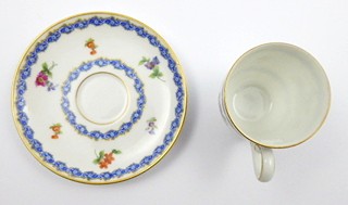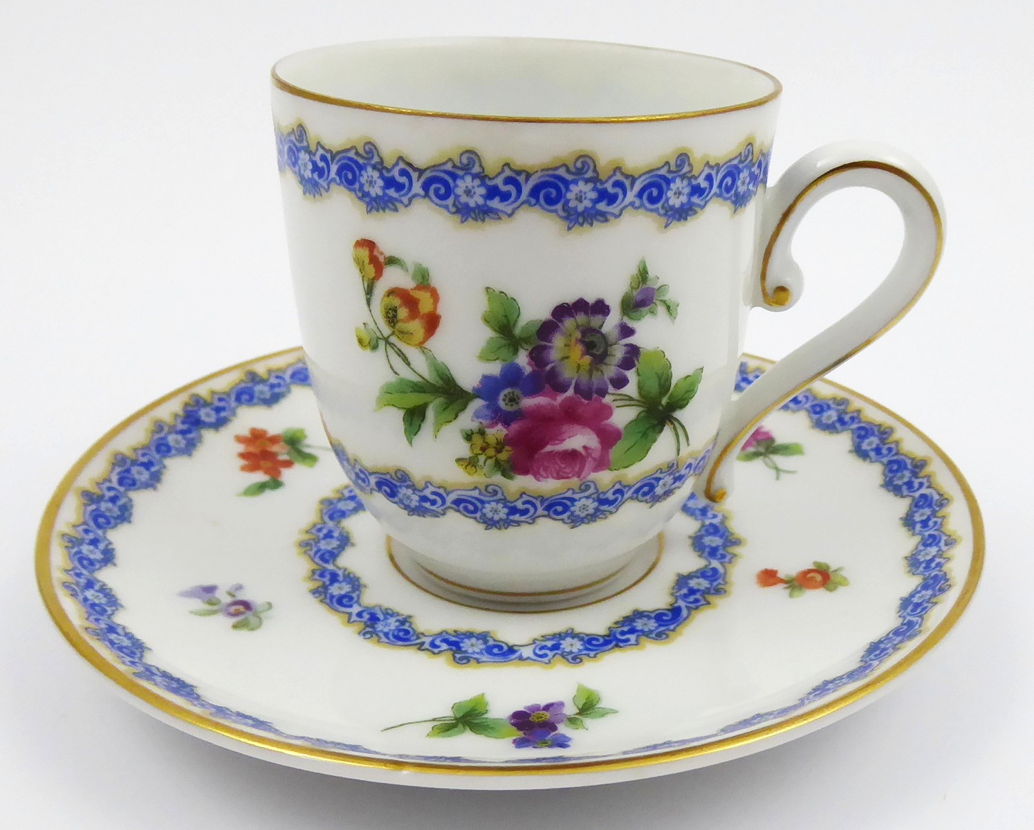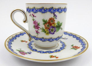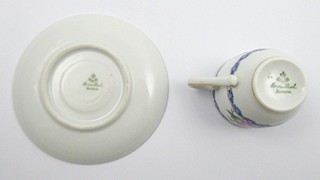 Německo, Rosenthal 1921 - 1922. Bílý, ručně barevně malovaný a zlacený porcelán. Porcelánka Rosenthal. Výška šálku 6 cm, průměr podšálku 12 cm. Kávový šálek s klenutým úchytem. Šálek s podšálkem ručně zdobené modrými stylizovanými věnečky a barevnými květinami. Značeno zespodu: značka výrobce Rosenthal odpovídající danému období, Bavaria.