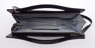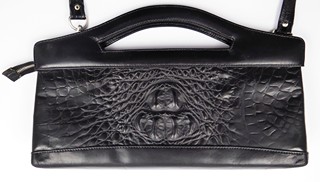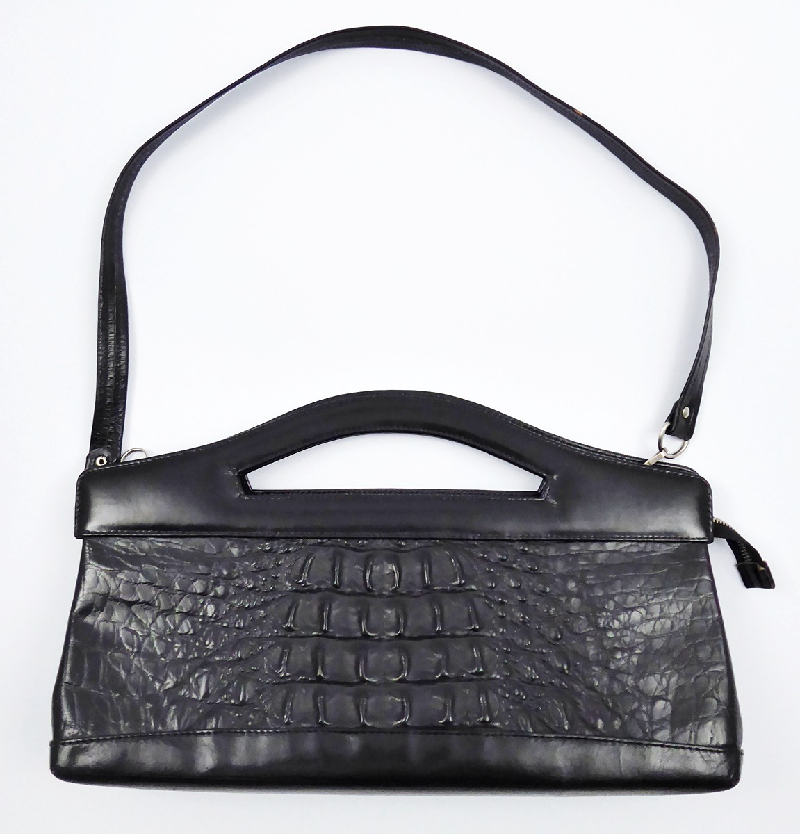 Střední Evropa 1935 - 1955. Černá krokodýlí přírodní kůže, bílý kov. Šířka 36 cm, výška 22 cm, délka popruhu 72 cm. Černá kabelka z pravé krokodýlí kůže s efektem krokodýlího hřbetu. Nositelná s držadly v ruce či přes rameno (přiložen popruh). Vnitřní část jednokomorová s dvěma protilehlými postranními kapsičkami. Popruh přes rameno místy odřený.