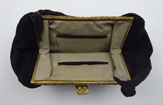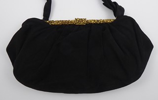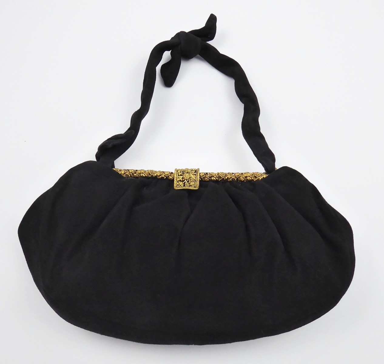 Střední Evropa, po polovině minulého století. Přírodní broušená kůže (semiš), mosaz. Šířka 37 cm, výška bez ucha 19 cm. Semišová kabelka s mosaznou prořezávanou aplikací u uzávěru v podobě florálních ornamentů. Vnitřek jednokomorový s postranními kapsičkami. Kabelka nese stopy používání.