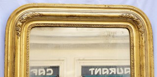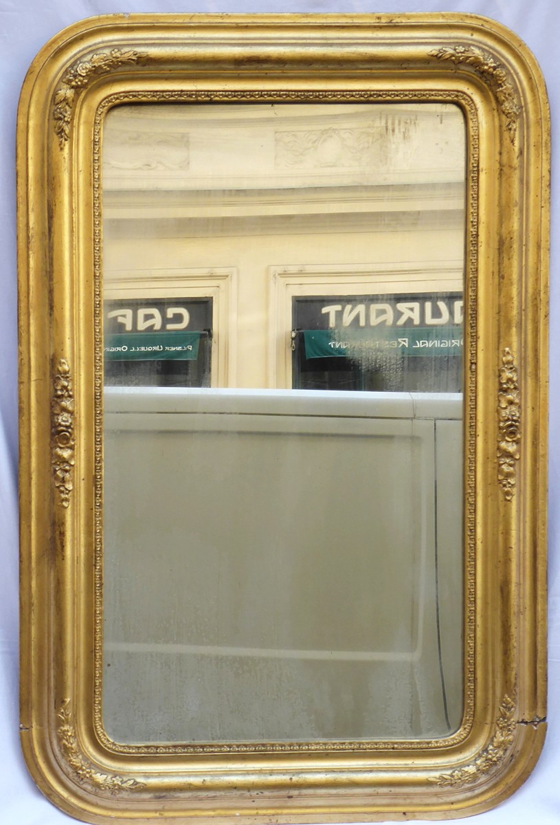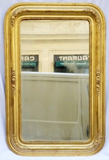 Čechy 1880 - 1910. Dřevo, zlacení, sklo. Výška 96 cm, šířka 65 cm. Závěsné zrcadlo se zlatě bronzovou patinou profilovaného tvaru s reliéfními florálními ornamenty. Původní zrcadlo. Použitý stav.