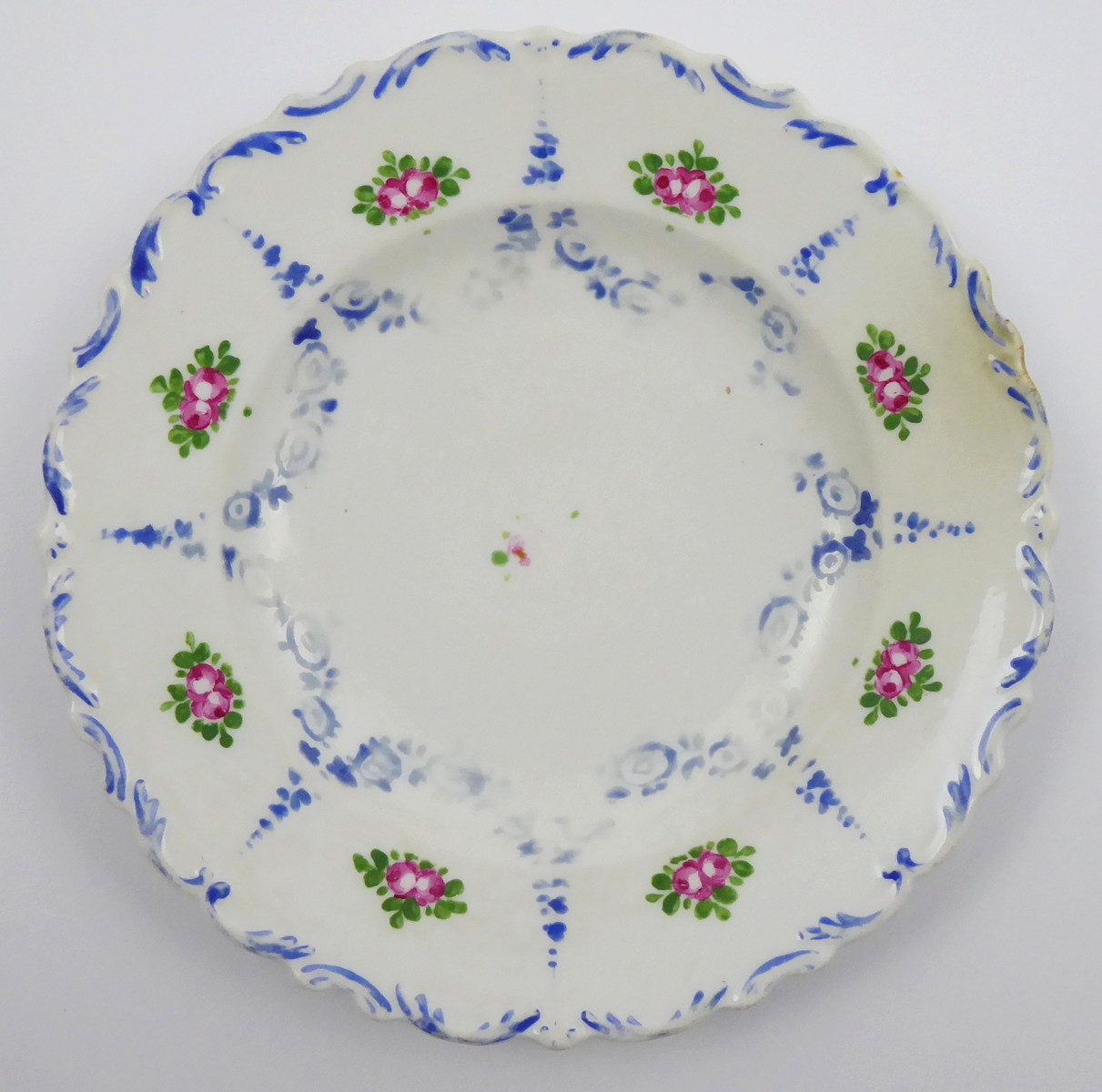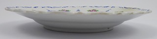 Čechy, Stará Role (Altrohlau) 1839 - 1858. Bílý a ručně barevně malovaný porcelán. Porcelánka Augustin Franz Nowotny, Altrohlau. Průměr 23 cm. Porcelánový talíř dekorovaný růžičkami s lístky a modrými květinovými ornamenty. Značeno zespodu: vtlačená písmena A:N:, 2XX.